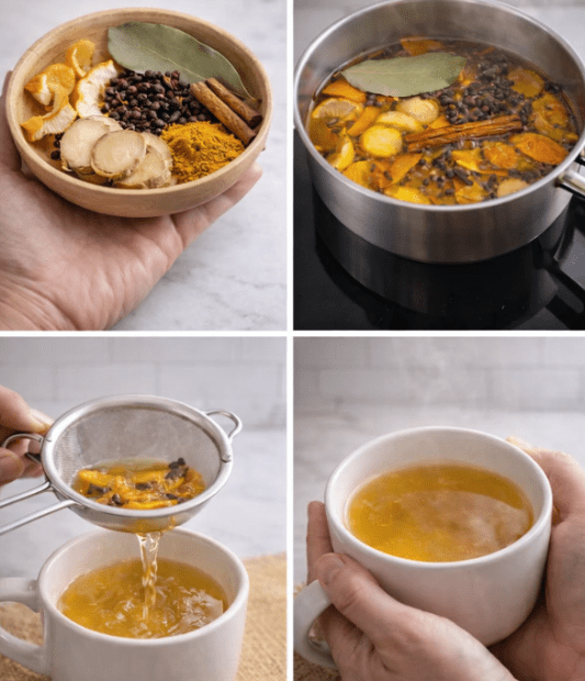 Ingredients: Bay leaf, turmeric (pinch or fresh), cloves, cinnamon stick, ginger slices, orange peel, water.