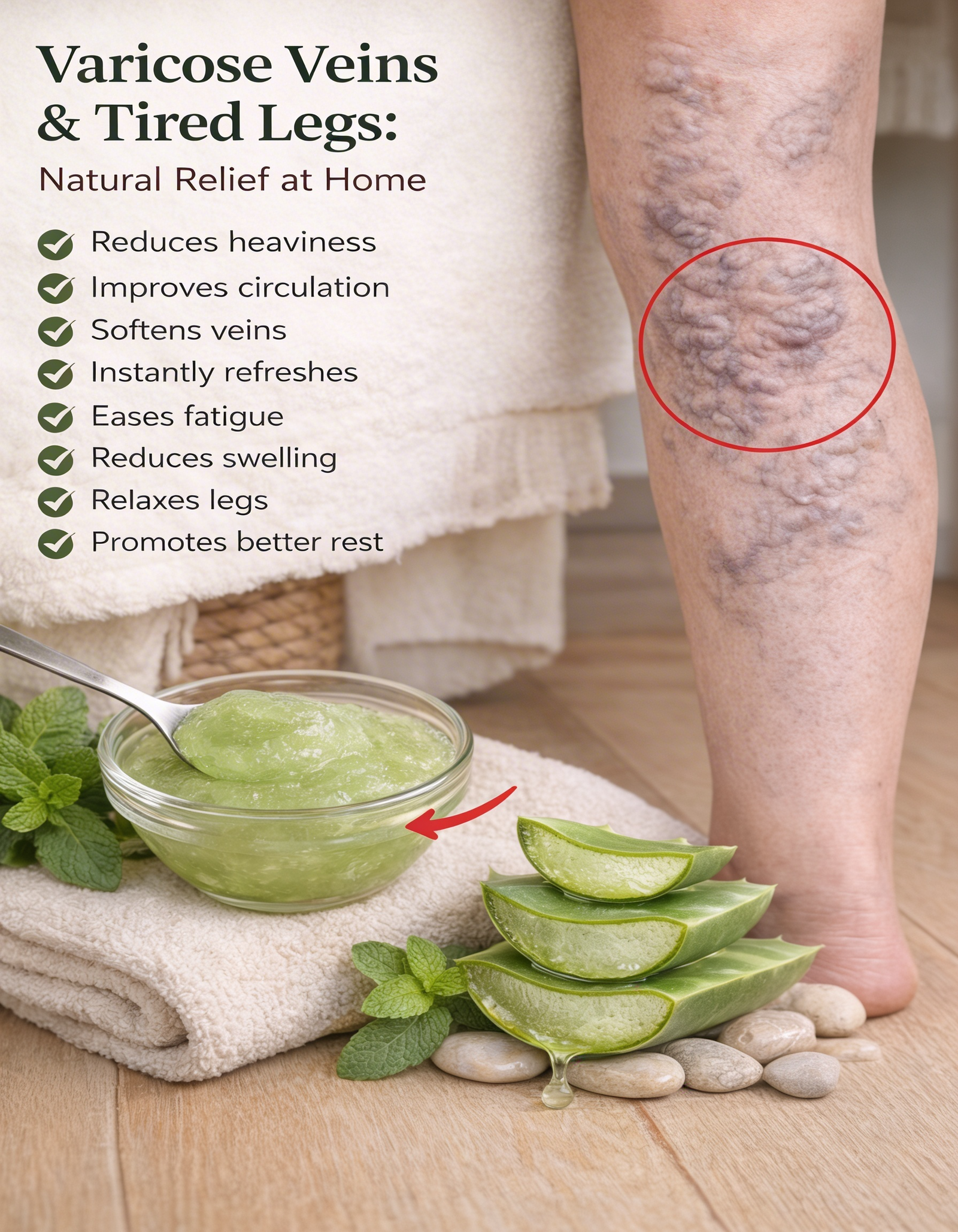After a long day on your feet, that heavy, aching sensation in your legs creeps in, making every step feel like a chore and turning simple evenings into restless discomfort. The swelling, the fatigue, the subtle throbbing that builds up from standing, walking, or even sitting too long—it disrupts sleep, drains energy, and leaves you dreading the next day. Many people turn to expensive creams or ignore it, hoping it fades, but the discomfort often lingers because everyday habits and circulation challenges keep feeding the cycle. But here’s the good news: a simple, natural approach using fresh aloe vera can offer soothing relief right at home—and there’s an easy homemade version that combines cooling and hydrating elements for even better comfort. Stick around to the end, where I’ll share a complete recipe and tips that many find surprisingly refreshing.