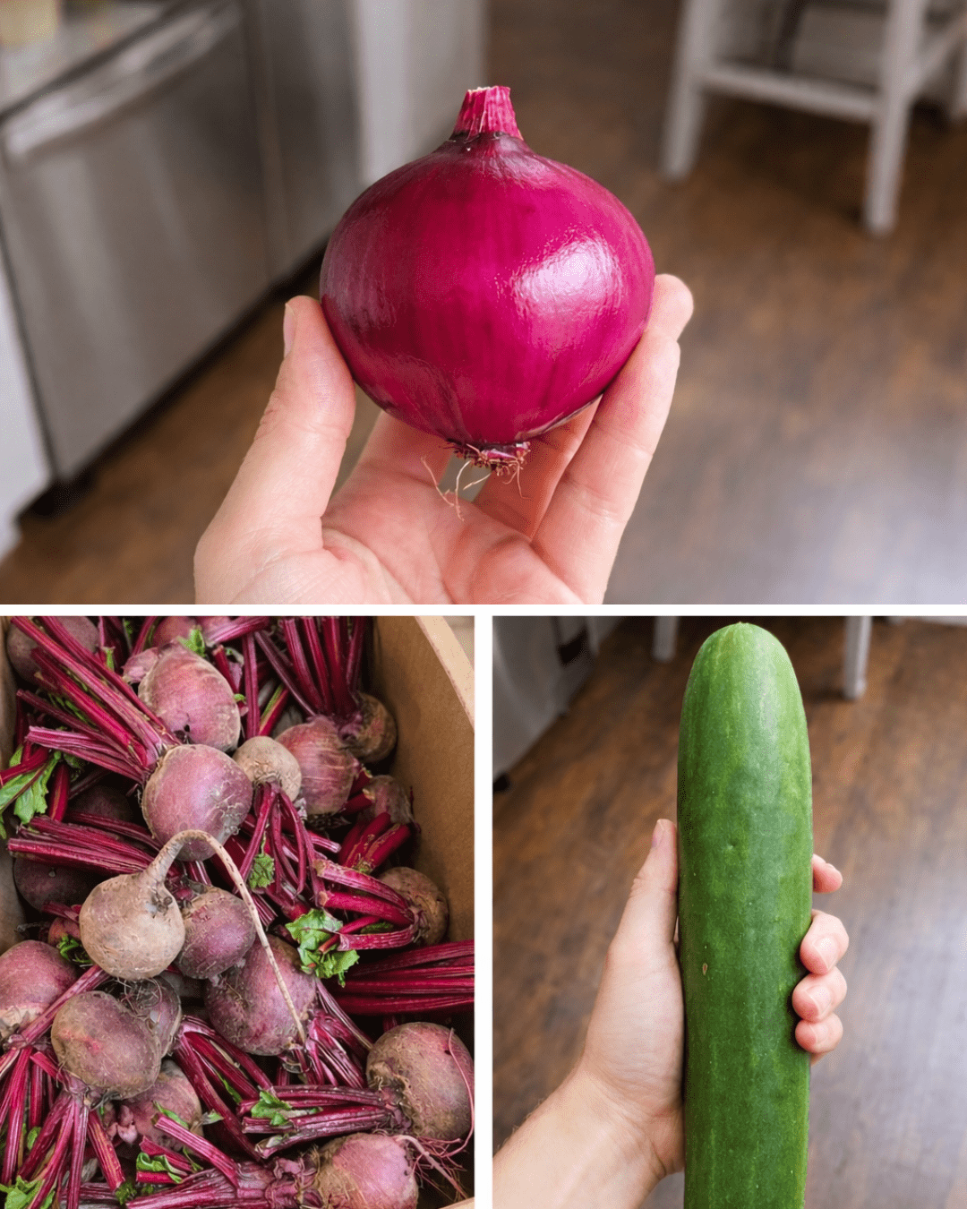 - Wash 1 medium beetroot, 1 large cucumber, and ½ medium onion.